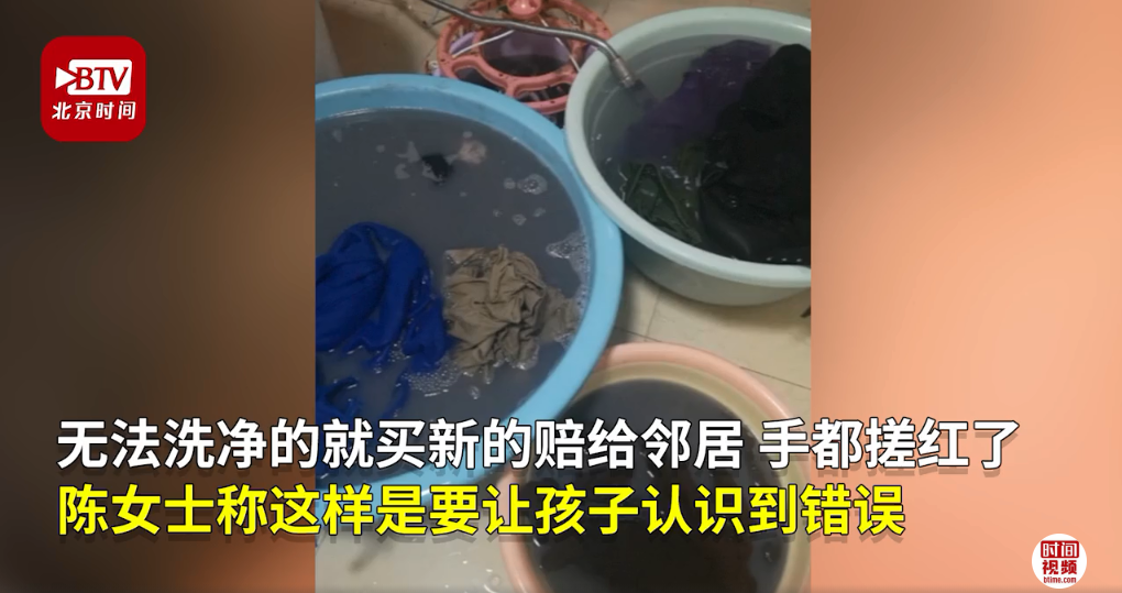 事情發生后,熊孩子的父母“兵分兩路”迅速補救:孩子媽媽帶著孩子挨家挨戶敲門道歉,并承諾把臟的衣服讓孩子手洗恢復,孩子爸爸請高空作業的保潔公司幫忙恢復墻體,要求孩子一直站在太陽底下看著,直到清潔工人清潔完畢,方可離開。